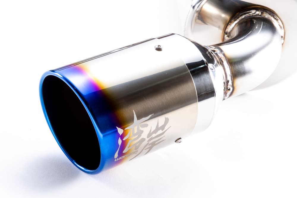 テールエンドには、高級感溢れるチタン製Φ114.3を採用。「チタン風」塗装ではなく、本物のチタンが生み出す深く鮮やかな焼き色と質感を追求しました。リアビューをより精悍に、より美しく引き立てます。